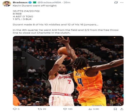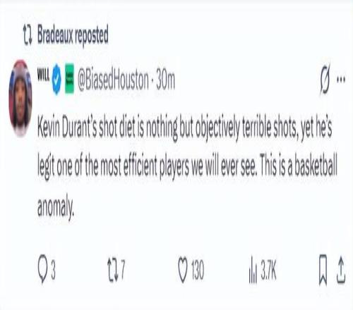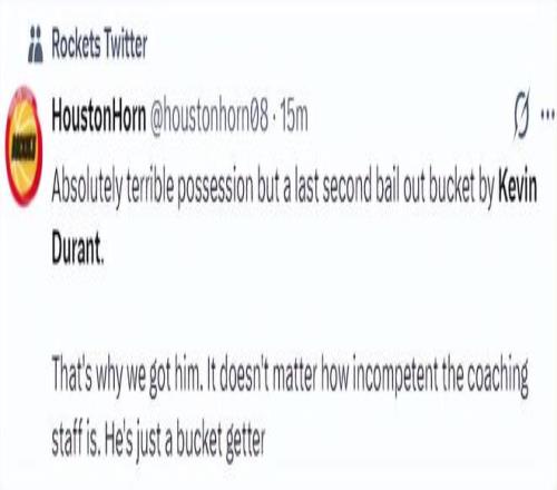 休媒:說實話我們打出了一場極其糟糕的比賽,但杜蘭特在最后一刻一人扛起火箭為球隊挽回顏面,這就是我們交易他的原因,無論教練組多么無能,他都能穩定輸出。