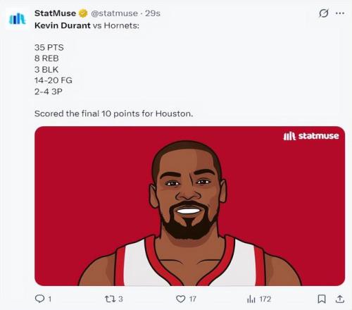 全場比賽杜蘭特36分鐘,20中14,三分4中2,罰球5中5,拿到35分8籃板4助攻1搶斷3蓋帽,命中率70%,三分命中率50%,真實(shí)命中率78.8%,杜蘭特再度打出了一場火箭生涯的代表作。