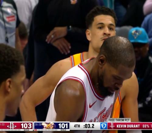 除了罰球的準(zhǔn)絕殺之外,自終場前5分27秒申京一個(gè)勾手命中后(95-84),火箭余下的5分26秒里只有杜蘭特一人得分,杜蘭特包攬了火箭全隊(duì)的最后10分。
