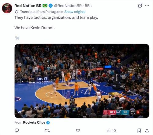 尤其是終場前22.8秒杜蘭特面對兩人封蓋的急停中投,這球幫助火箭再度領(lǐng)先5分,如果沒有這一個(gè)中投結(jié)局可能又被改寫了,杜蘭特?zé)o愧是超級巨星。