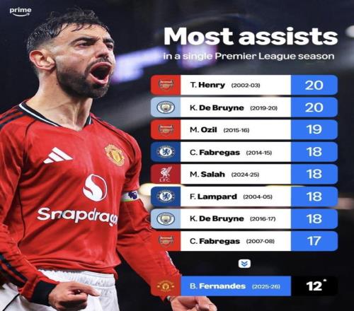 最近prime video sportuk整理了英超單賽季助攻紀錄榜,亨利和德布勞內把數字頂在20次這條線上。眼下費爾南德斯本賽季已經送出12次助攻,按這份統計,曼聯還剩14場聯賽,他只差9次助攻就能把紀錄改寫。問題擺在這兒:就看曼聯接下來的賽程強度和他最近這段送餅手感,費爾南德斯真能把亨利的20次助攻踩過去嗎?