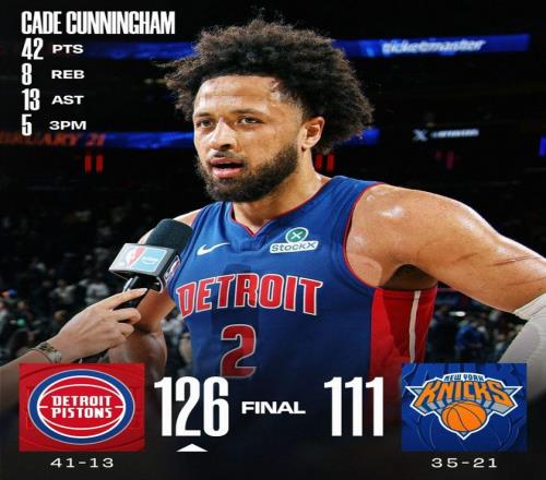 此役過后,活塞41勝13負高居聯盟榜首,而尼克斯35勝21負看似還穩坐東部第三,實則戰績已被騎士追平,隨時可能被反超。