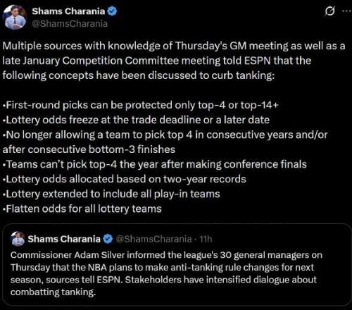 2月2日,根據(jù)Shams消息,NBA總裁肖華已正式通告聯(lián)盟30支球隊(duì)高管,NBA將在下賽季調(diào)整防擺爛規(guī)則!