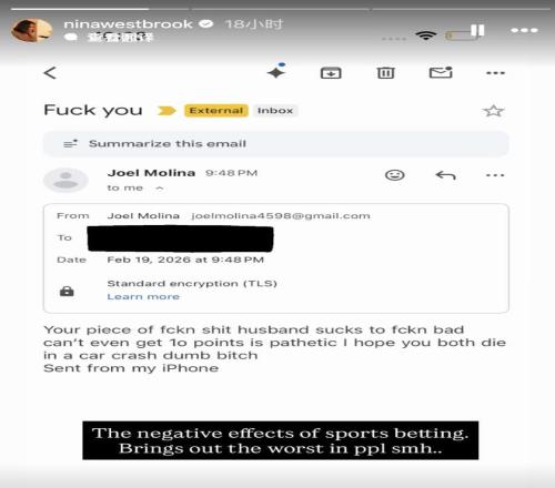 北京時間2月21日,NBA球員拉塞爾-威斯布魯克的妻子妮娜-威斯布魯克分享了她在丈夫周四晚比賽后收到的一封來自球迷的惡毒電子郵件。