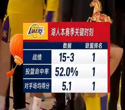 比賽結束前轉播方給出,湖人關鍵時刻15勝3負聯盟第一,那么此役后湖人關鍵時刻就是16勝3負延續聯盟第一,投籃命中率、對手場均得分也均為聯盟第一。