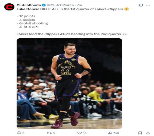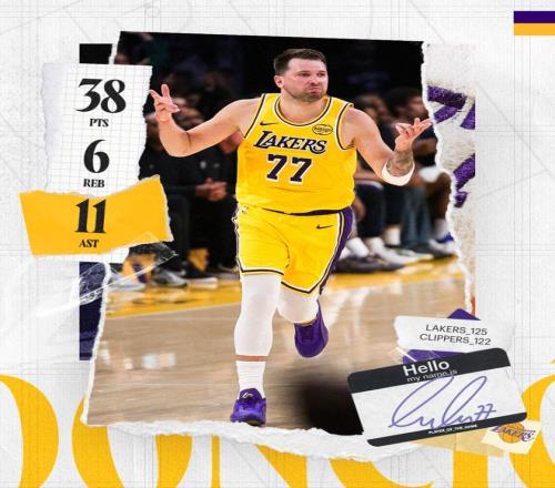 北京時間2月21日,湖人以 125-122擊敗快船。這場比賽湖人三巨頭里夫斯、東契奇、詹姆斯合計拿到80分,東契奇更是狂攬38分11助攻6籃板8個三分球的炸裂數據,他是這場比賽湖人贏球的第一功臣,末節兩個三分都非常關鍵。此役后湖人本賽季關鍵時刻16勝3負繼續聯盟第一。