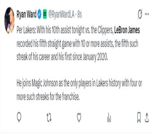 此役詹姆斯完成連續5場比賽10+助攻生涯第五次,也是自2020年1月份后首次,更是與魔術師并列湖人隊史僅有兩位至少4次連續五場助攻上雙的球員。
