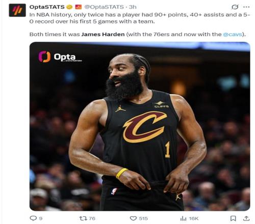 根據數據媒體的統計,一名球員換隊后的前五場比賽,能得到90分以上、助攻數超過40次以上且球隊戰績5勝0負的球員只有詹姆斯-哈登,NBA歷史上出現了兩次都是哈登,上一次是出現在費城76人。