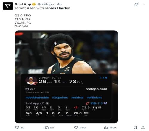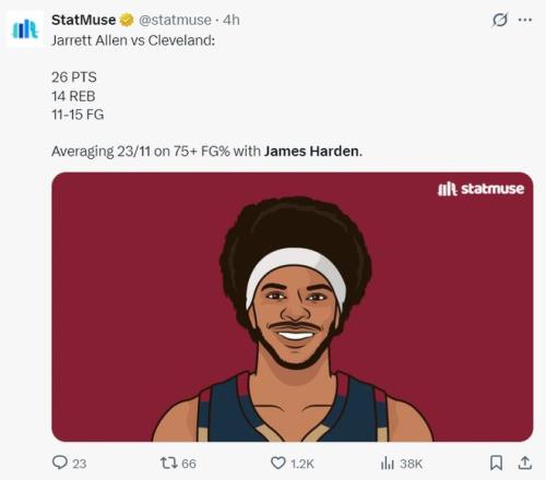 在哈登加盟騎士后,賈萊特-阿倫是最受益的那個,他場均拿到22.6分11.2籃板,真實命中率76.3%。