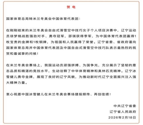 2月20日,遼寧省委省政府發賀電:在剛剛結束的米蘭冬奧會自由式滑雪空中技巧男子個人項目決賽中,遼寧運動員王心迪沉著應戰、穩定發揮,為中國體育代表團再添1枚金牌,為祖國和人民贏得了榮譽。遼寧省委、省政府謹向國家體育總局并中國體育代表團及中國自由式滑雪空中技巧隊表示熱烈祝賀和誠摯問候!