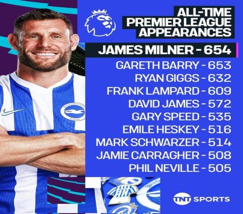 英超第27輪,布萊頓客場對陣布倫特福德,40歲的老將米爾納首發出場,他也以654次出場超越加雷斯-巴里,正式創造英超歷史出場紀錄!