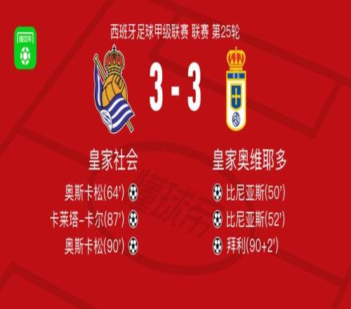 北京時間2月21日西班牙足球甲級聯賽 聯賽 第25輪,皇家社會主場對陣皇家奧維耶多。皇家社會奧斯卡松梅開二度,卡萊塔-卡爾破門。皇家奧維耶多比尼亞斯梅開二度,拜利破門。最終比分皇家社會 3-3 皇家奧維耶多。