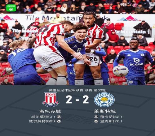 北京時間2月21日英格蘭足球冠軍聯賽 聯賽 第33輪,斯托克城主場對陣萊斯特城。斯托克城威爾莫特梅開二度。萊斯特城穆卡薩破門,溫克斯建功。最終比分斯托克城 2-2 萊斯特城。萊斯特城遭遇7輪不勝,仍然位居英冠降級區。