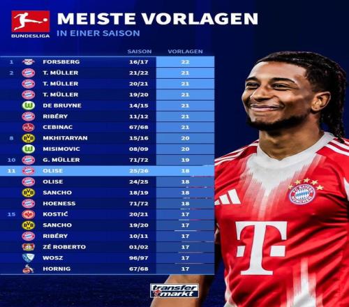 北京時間2月21日,來自德轉(zhuǎn)的統(tǒng)計(jì)指出,拜仁慕尼黑邊鋒奧利塞距離德甲歷史單賽季的助攻數(shù)紀(jì)錄還有4次之遙。