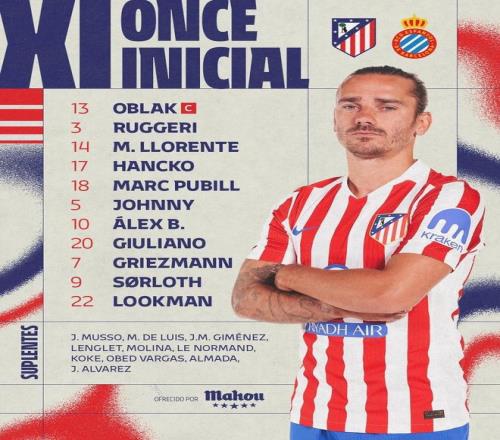 馬競首發:13-奧布拉克、14-馬科斯-略倫特、18-普維爾、17-漢茨科、3-魯杰里、20-小西蒙尼、5-卡多佐、10-巴埃納、22-盧克曼、7-格列茲曼、9-瑟洛特