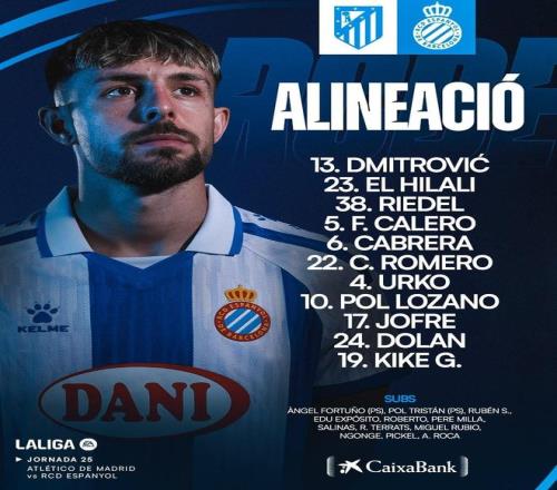西班牙人首發:13-德米特羅維奇、23-希拉利、38-里德爾、5-卡萊羅、6-卡夫雷拉、22-卡洛斯-羅梅羅、17-卡雷拉斯、10-洛薩諾、4-烏爾科-岡薩雷斯、24-多蘭、19-基克-加西亞