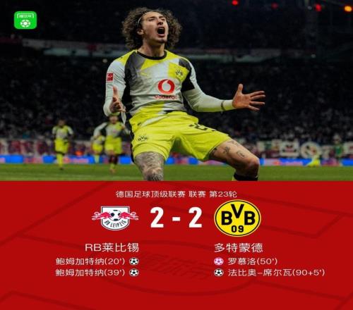 北京時間2月22日德國足球頂級聯賽 聯賽 第23輪,RB萊比錫主場對陣多特蒙德。上半場迪奧曼德晃動送助攻,鮑姆加特納破門,之后勞姆傳中,鮑姆加特納破門完成雙響。下半場羅慕洛頭球自擺烏龍,補時階段阿德耶米傳中,法比奧-席爾瓦扳平。最終多特2-2戰平萊比錫。