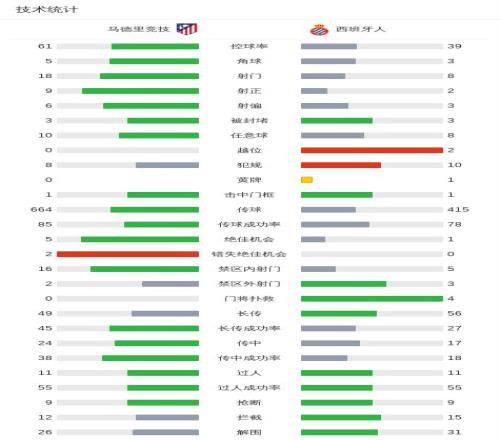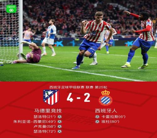 北京時間2月22日西班牙足球甲級聯(lián)賽 聯(lián)賽 第25輪,馬德里競技主場對陣西班牙人。上半場,卡雷拉斯破門,瑟洛特扳平比分。下半場,巴埃納助攻,小西蒙尼幫助馬競反超比分。魯杰里隨后送出兩次助攻,盧克曼和瑟洛特相繼破門。埃杜遠射得分,為客隊扳回一城。全場比賽結(jié)束,馬競4-2擊敗西班牙人。