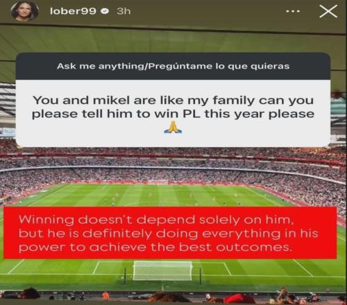 阿爾特塔的妻子Lorena在IG上發(fā)圖文回應(yīng)了球迷的提問,這名球迷表示“你能不能告訴阿爾特塔,請(qǐng)拿下今年的英超冠軍”。