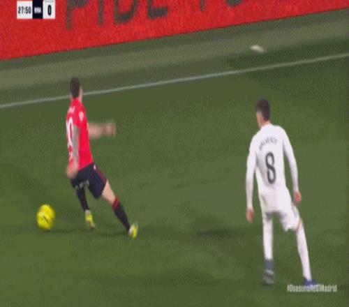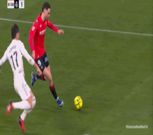 這是足球場上最殘酷的現實,于是在第90分鐘,奧薩蘇納在中線區域施加壓力,讓皇馬出現了失誤: