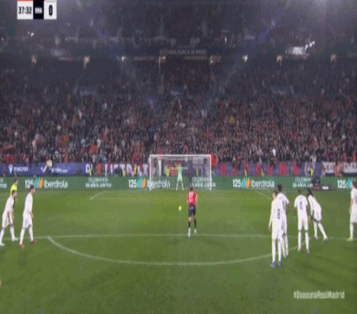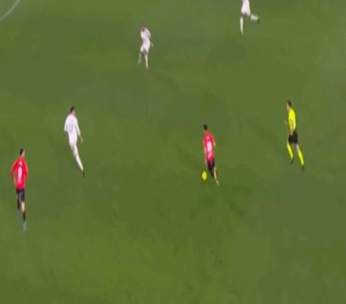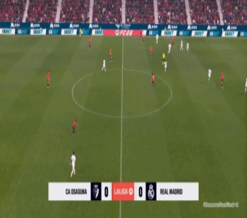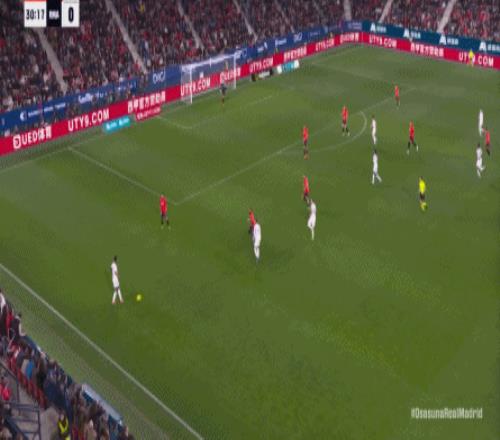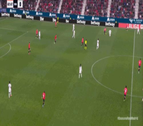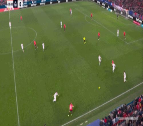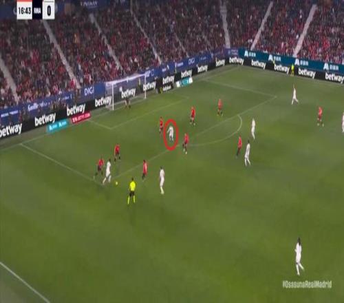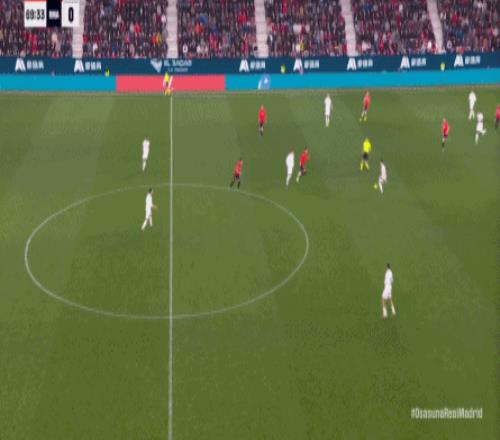其中一次就是上半場的開分球,在皇馬的進攻和逼搶都極其低效的情況下,奧薩蘇納很容易地就能獲得起腳空間,就像這次,在邊路的處理壓力都不大,于是一腳斜長傳打到結合部,讓皇馬付出了點球的代價: