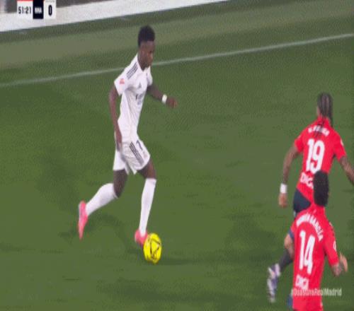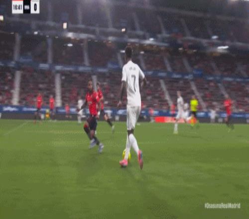 首先在進攻端,維尼修斯從邊路啟動進攻,起腳質量不佳,直接被奧薩蘇納門將沒收,維尼修斯必須要從邊路開打,包括姆巴佩帶著防守球員到他身邊接球的思路,都是皇馬的老毛病了,一點都不稀奇: