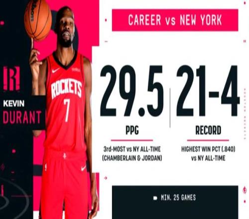 值得一提的是,杜蘭特生涯面對尼克斯場均29.5分,尼克斯對手中歷史第三位,僅次于張伯倫和喬丹。