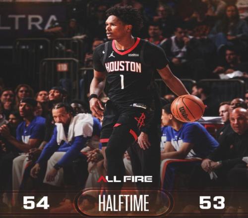 申京內(nèi)線轉(zhuǎn)身暴扣、弧頂三分球連拿5分,火箭將分差縮小至1分。唐斯迎著防守強(qiáng)投三分命中打破得分荒,杜蘭特加速突破完成暴扣,隨后再造殺傷兩罰全中,半場戰(zhàn)罷,火箭54-53反超尼克斯。