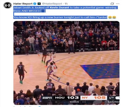 如果沒有看比賽,大家會認為小賈巴里-史密斯、凱文-杜蘭特兩人在關鍵時刻一人投丟了一個關鍵球,但看了比賽的球迷就知道杜蘭特決勝時刻的表現堪稱戰犯。