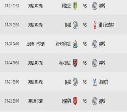 曼城未來(lái)6輪對(duì)手:利茲聯(lián)(15)、諾丁漢森林(17)、西漢姆(18)、水晶宮(14)、切爾西(4)、阿森納(1)。