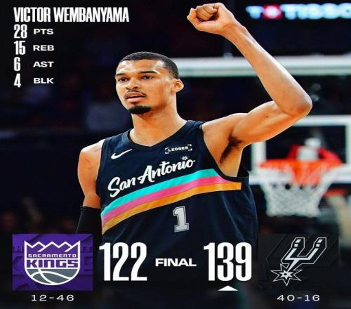 本賽季至今,文班亞馬的表現:出戰42場比賽,場均上場29分鐘,得到24.3分11.2籃板2.9助攻2.7蓋帽1.0搶斷,三項命中率51.1%/35.7%/80.9%,真實命中率62.2%,馬刺戰績40勝16負。