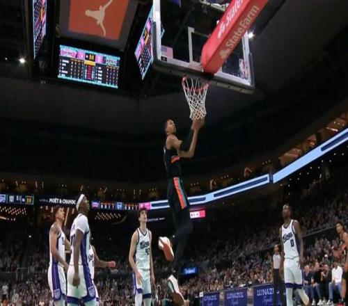 ——緊接著的一個回合,文班亞馬單挑雷諾,一個后衛式的停頓假轉身,晃出空間加速又是扣籃,這球籃下的基根穆雷也是一點辦法也沒有