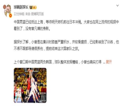 根據(jù)媒體人球圈趙探長報道:“曾凡博是在集訓時,膝蓋嚴重積水,并軟骨磨損,已經(jīng)影響到訓練,他不得不跟郭士強指導請假養(yǎng)傷,提前結(jié)束這次國家隊之旅。”