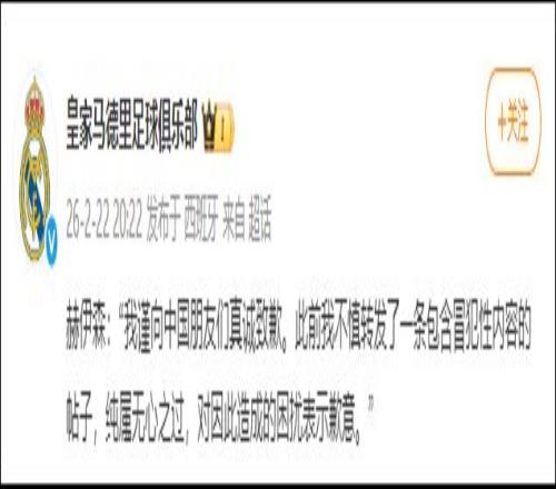 2月22日晚,西班牙皇家馬德里足球俱樂部球員赫伊森就社交媒體發布辱華貼文一事,向中國網友道歉。