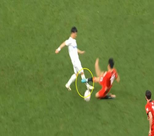 接著,魏震也在一次飛鏟中踹到對手的小腿(下圖),李海新照樣沒有任何表示,黃牌都沒有。難道是李海新的執法風格寬松,少出牌?未必。