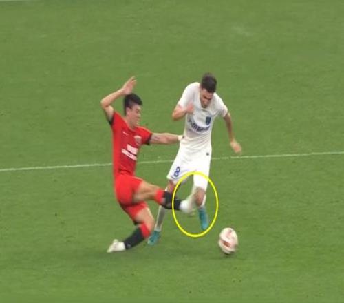 這場比賽中,海港球迷幾次紅牌鏟球動作都逃過處罰。比如李帥在比賽中飛鏟抬腳亮鞋釘踢到南通支云球員的膝蓋(下圖),李海新不僅沒給紅牌,連黃牌都沒掏。