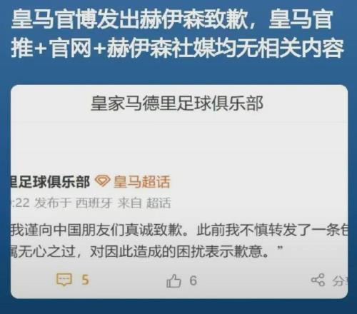 目前,皇家馬德里足球俱樂部賬號分別在微博和某站發(fā)布了道歉動態(tài),內(nèi)容如下: