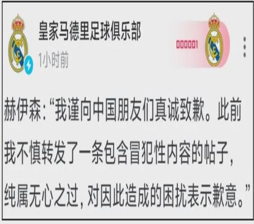 赫伊森:“我謹(jǐn)向中國朋友們真誠致歉。此前我不慎轉(zhuǎn)發(fā)了一條包含冒犯性內(nèi)容的帖子,純屬無心之過,對因此造成的困擾表示歉意。”