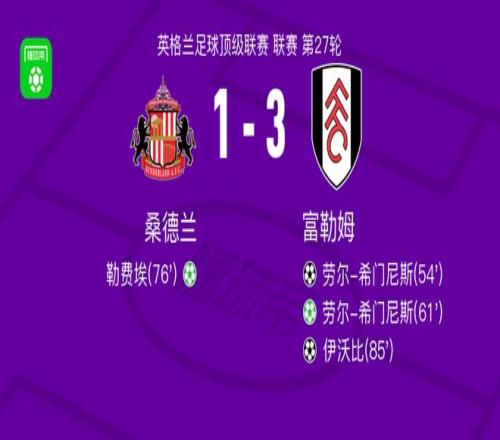 北京時間2月22日英超聯賽 第27輪,桑德蘭主場對陣富勒姆。勞爾-希門尼斯梅開二度,伊沃比傳射建功,勒費埃點射破門難救主。最終,桑德蘭主場1-3不敵富勒姆。