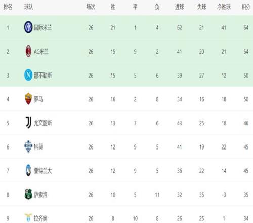 在積分榜上,國際米蘭遙遙領先。國際米蘭21勝1平4負,拿到64分,排名榜首。而AC米蘭輸球后,依然是54分,排名第2,整整落后國際米蘭10分。冠軍的歸屬基本沒有懸念了。那不勒斯50分,排名第3。羅馬贏球后,積分已經追平那不勒斯,也是50分,排名第4,但因為與那不勒斯兩回合交手戰績處于劣勢,只能排在那不勒斯身后。尤文圖斯只拿到46分,排名第5,被羅馬甩開4分。科莫和亞特蘭大都是45分,排名第6和第7。