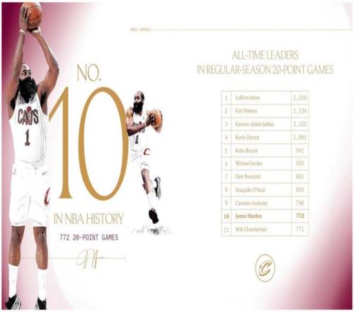 同時本場是哈登生涯第772次單場砍下20+得分表現(xiàn),成功超越名宿張伯倫升至NBA歷史第10,安東尼以796場排名第九,詹姆斯1310場位列歷史第一。