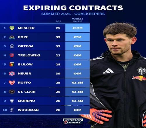 德國轉會市場統計了今夏合同到期的十大門將,其中球員按照身價從高到低排序。