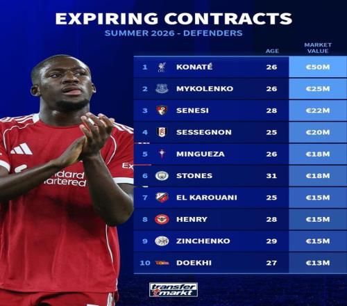 德國轉(zhuǎn)會市場統(tǒng)計了今夏合同到期的十大后衛(wèi),其中球員按照身價從高到低排序。