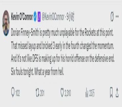 誰是火箭本賽季最失敗的引援?毫無疑問,芬尼-史密斯!NBA名記Kevin O'Connor寫道:“芬尼-史密斯在火箭的表現已經到了幾乎無法上場的地步。他在防守端的作用,也不能彌補他糟糕至極的進攻表現,真是噩夢一般的賽季!”