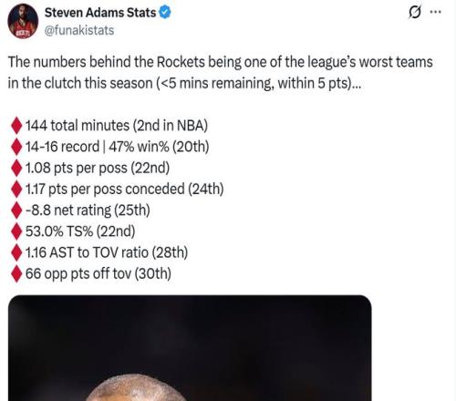 并且火箭隊關(guān)鍵時刻各項數(shù)據(jù)均排在聯(lián)盟墊底行列,開賽至今當(dāng)比賽進入關(guān)鍵時刻時(最后5分鐘,分差5分以內(nèi)),火箭隊?wèi)?zhàn)績僅為14勝16負(fù)聯(lián)盟第20。