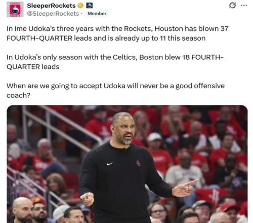 自從烏度卡執(zhí)教火箭隊至今,已經(jīng)37次在末節(jié)領(lǐng)先情況下被逆轉(zhuǎn),本賽季已經(jīng)11次末節(jié)被逆轉(zhuǎn),并且這樣的表現(xiàn)并非偶然,在其執(zhí)教凱爾特人唯一的一個完整賽季中,凱爾特人也曾18次在末節(jié)被逆轉(zhuǎn)。