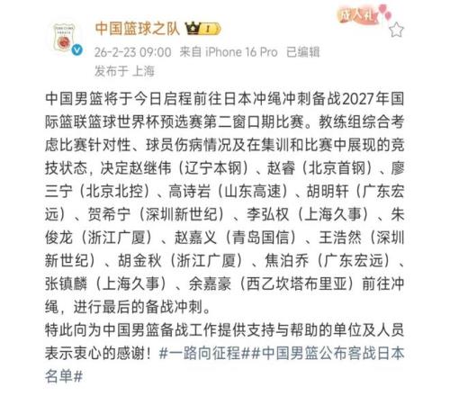 2027年男籃世界杯亞洲區預選賽第二窗口期賽事臨近,中國男籃正式公布了客戰日本隊的14人名單,時下為西乙埃斯特拉俱樂部效力的余嘉豪赫然在列,他也是本次名單中唯一一位海外征戰的球員。
