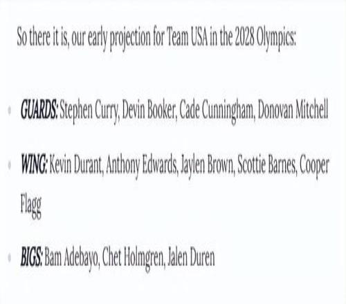 2028年的美國男籃陣容會明顯更年輕、更快、更具運動能力。如果杜蘭特與庫里真的帶隊、最后一次沖擊衛冕金牌,我們很可能看到一支類似上述預測的12人隊伍。