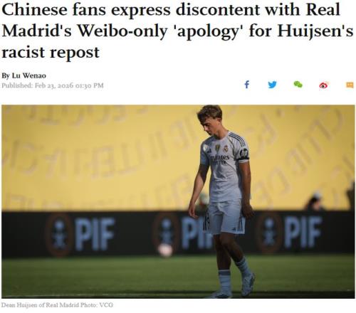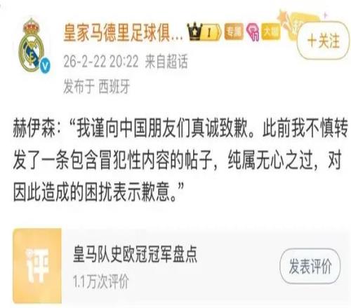 2月22日,皇家馬德里足球俱樂部官方微博發(fā)布道歉聲明,轉述豪森的回應,稱此事“純屬無心之過”。豪森表示:“我謹向中國朋友們真誠致歉。此前我不慎轉發(fā)了一條包含冒犯性內(nèi)容的帖子,純屬無心之過,對因此造成的困擾表示歉意。”