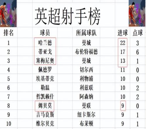 射手榜方面,哈蘭德22球領跑,蒂亞戈17球排在第2,塞梅尼奧13球位列第3。姆貝莫今天未能進球,還是和吉馬良斯,維爾貝克9球剛好擠入前十。謝什科錯失梅開二度良機,還差2球才能進前十。